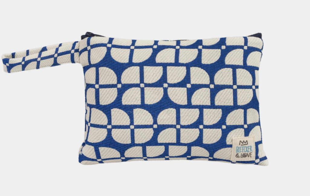The Bleecker Bag has interior waterproof lining, a convenient wrist handle and top zipper closure.
